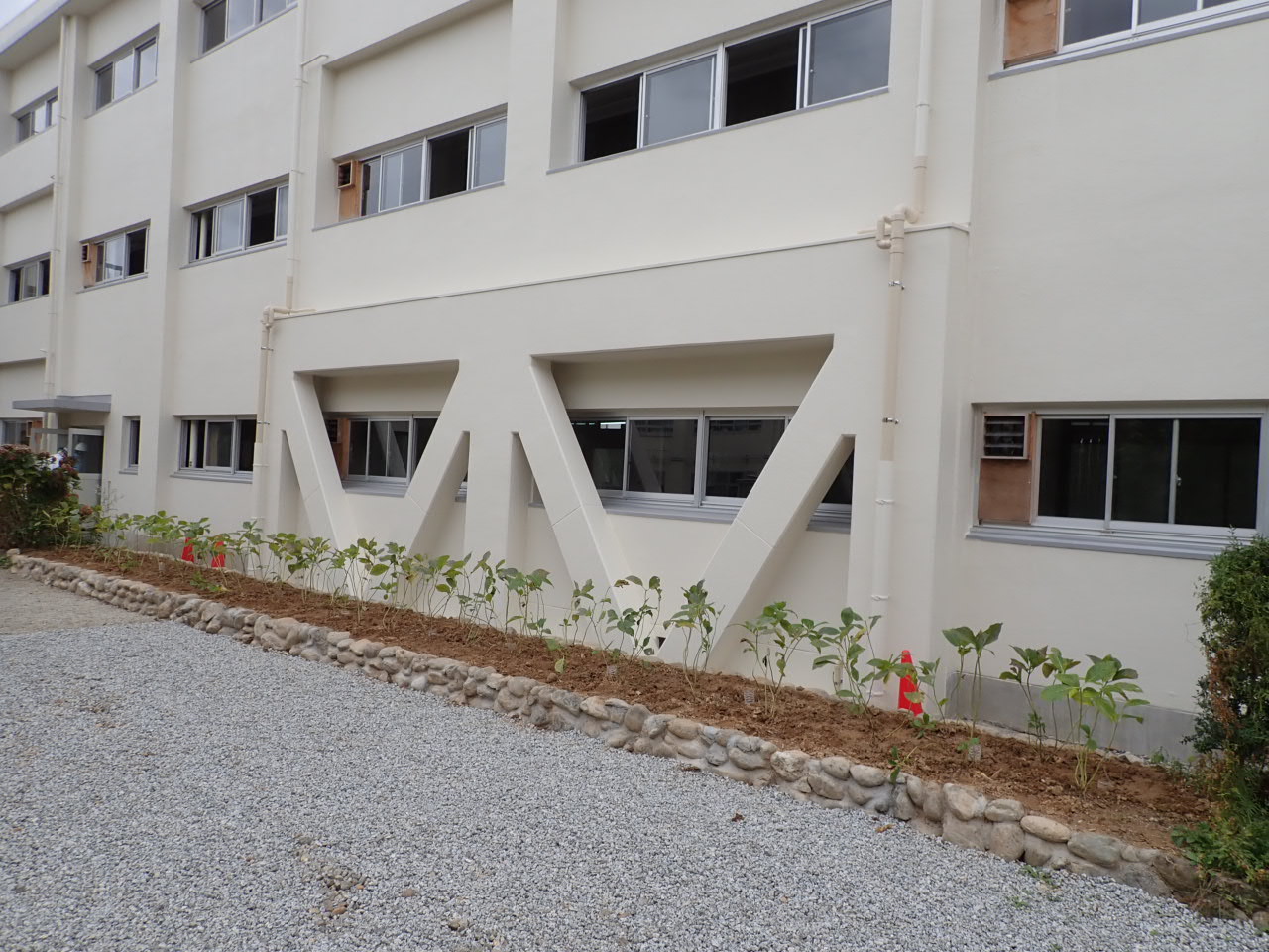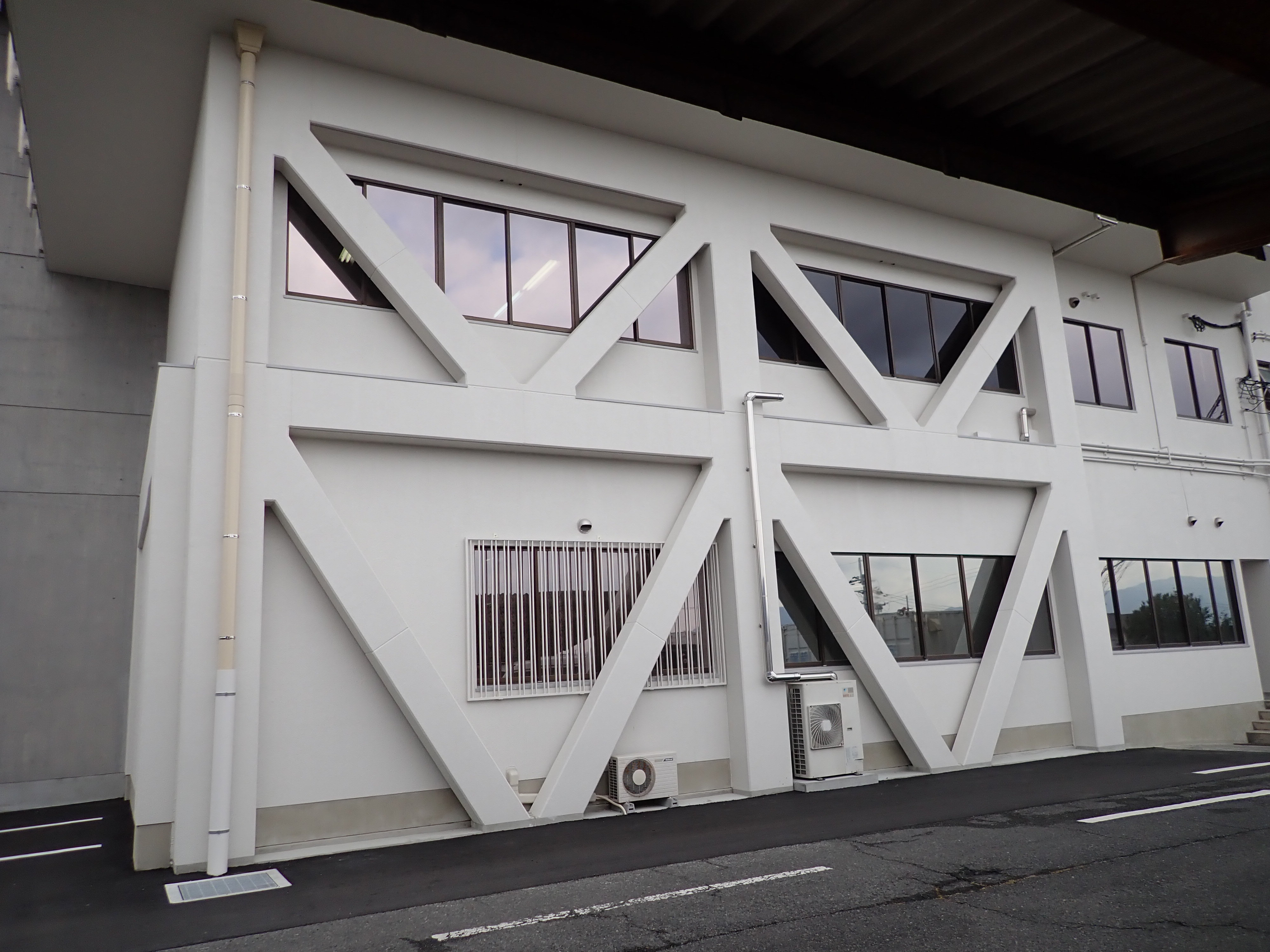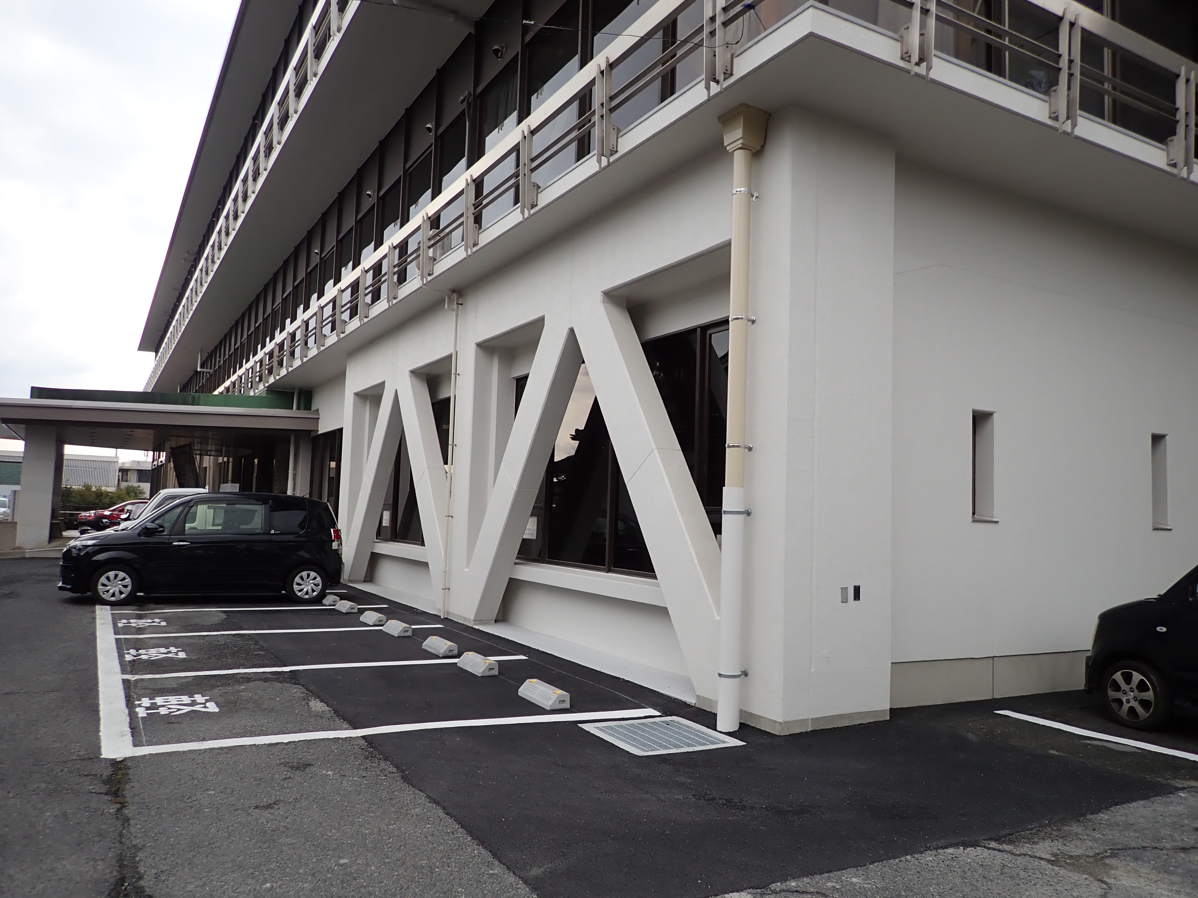 | 学校や病院等さまざまな施設の建物内部作業をする必要がなく、外部作業だけで建築物の耐震性を向上させる工法で施工しています。 | |